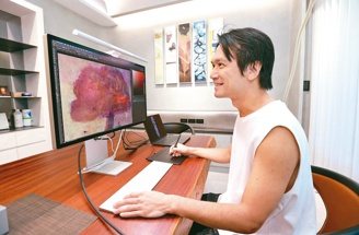 現在鑒予作畫的方式,通常是先畫線稿,然後使用複合媒材簡單上色,接著便放進電腦裡做後續處理。訪談進行當下,他面前巨大的螢幕裡亦展示著近期著手繪製的圖。