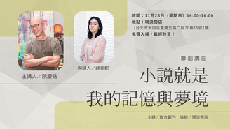 小說就是我的記憶與夢境 主講人: 阮慶岳 與談人╱主持人: 蔣亞妮 時間:11月23日(星期日)下午2:00-4:00 地點:現流冊店(台北市大同區重慶北路二段70巷15號1樓) 免費入場,歡迎聆賞 ......