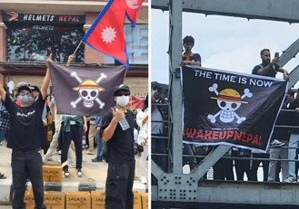 尼泊爾的抗議青年高舉航海王旗幟。取自Threads