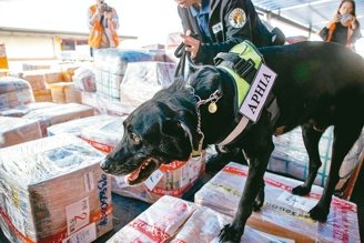 | 「護國神犬」檢疫犬在機場努力檢查入境旅客行李是否藏有違禁品。聯合報記者季相儒/攝影 |