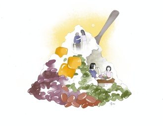 那抹淺淺的笑,讓我想起十多年前的那個下午。彼時外婆的身體還勇健,住在嘉義的透天厝裡。夏天一到,她總帶我到朴子市場裡吃剉冰,一碗三十五元,四樣料,又濃又香的糖水從冰山頂端淋下,外婆嘴裡吃著冰,表情平靜,但愉悅默默潛伏在她眼皮下,一抬眼就能看到。年幼的我不禁跟著雙眼發光,與外婆拿著湯匙,一勺勺,挖出一個個璀璨耀眼的夏天。
