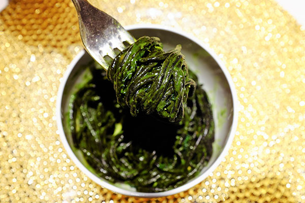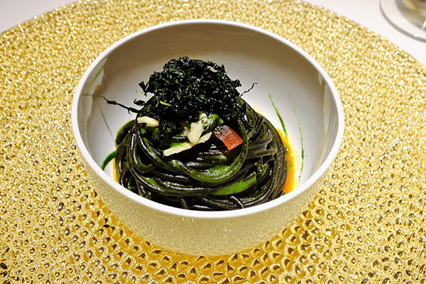 Black spaghetti, sea urchin, walnuts, fried kale and candied pepper¡G³o´N¬O¥¦Ìªº©ÛµPµæ¾¥³½¥Ä¸q¤j§QÄÑ¡A¸Ì±¦³®üÁx¡A®üµæ§@ªººñ¦â¿@¥Ä©M¿}¤ÆJ´Ô¡A®Ö®ç¡A¤W±¦A¥[¤W¤F¬µªº¦Ð¦ç¥ÌÂÅ¡C