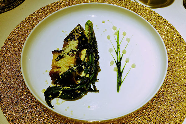 Pork cheek and belly, chamomile potatoes cream, charred turnip greens, green apple, horseradish¡G½ÞÁyÀU¦×©M½Þ¸¡¦×¡A¤U±¬O¬v¥Ìµâ°¨¹aÁ¦ªd¡A¤W±¬O»¶®ÚÂæ¡A¤@®Ç¬O¯N¿¾µ×¸¡A¨º¨Ç«CÄ«ªG¤BÁÙÂ\¥X¤F¤@¾ðºñ·N¨Ó¤F¡C