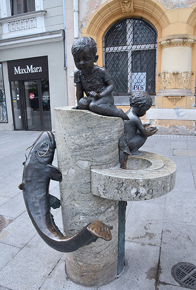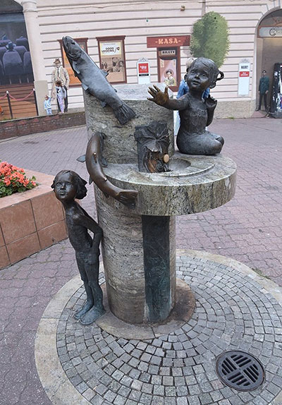 | 街上有多座以魚和孩童塑像構成的飲水台。 |