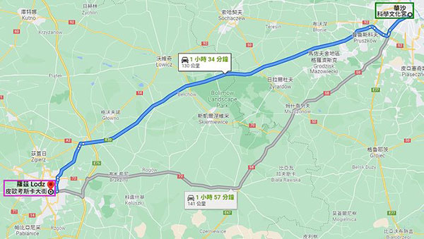 揮別華沙驅車向南,前往波蘭第二大城市克拉科夫(Krakow),因為路途遙遠,就來了位在波蘭幾近正中心位置的第三大城羅茲(Łódź,波蘭文發音較接近「沃區」)途中暫停車透透氣。華沙文化科學宮到羅茲的皮歐考斯卡大街(Piotrkowska Street)路程約130公里。