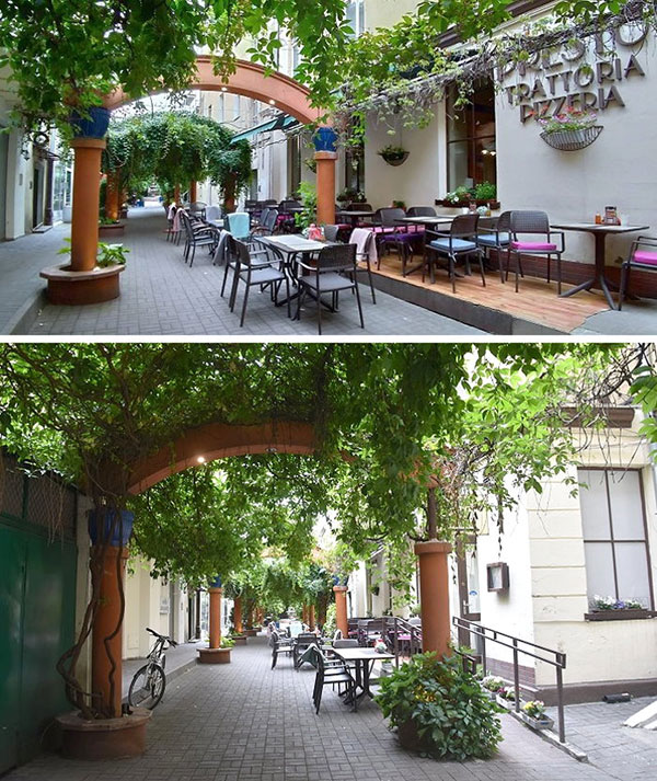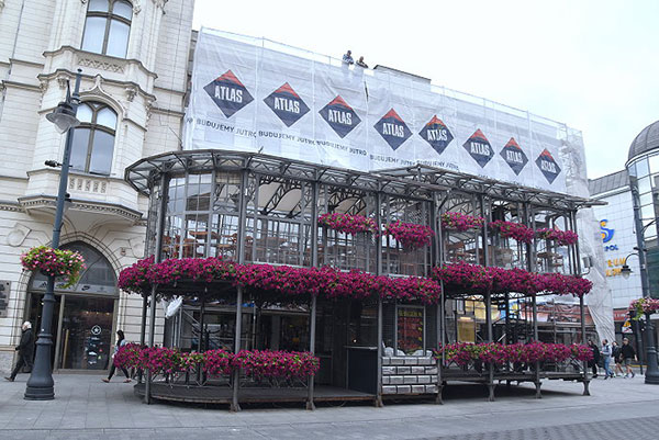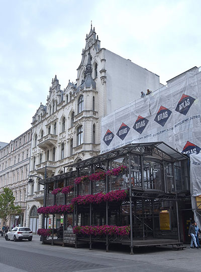 鮮花裝飾的鐵架亭是Łódź ul. Piotrkowska kamera online WebCamera.pl,應該是咖啡廳。
