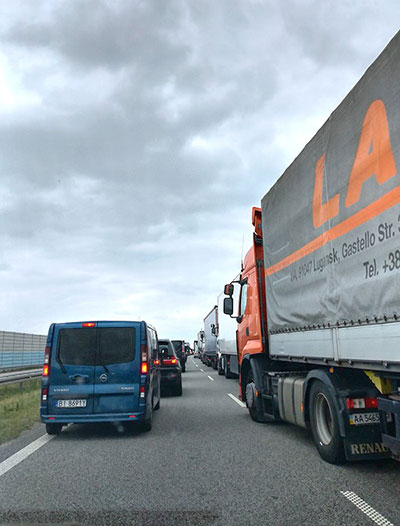 行駛在E30國際公路上遇見大塞車的景況:小型車走內側車道,大型車都在外側車道,即使塞車也塞得井然有序。