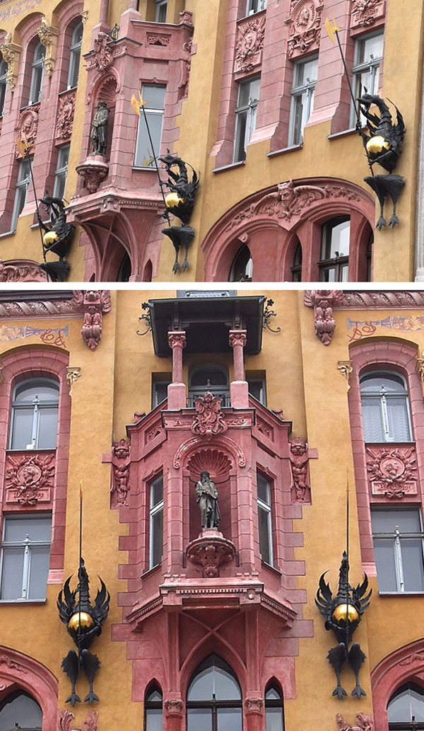 面向街道立面的中央凸窗壁龕當中,是現代印刷術創造者揚·古騰堡(Johannes Gutenberg)的雕像。有黑龍持長柄斧抱金球的雕刻裝飾相當搶眼。