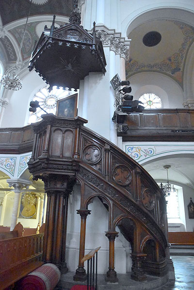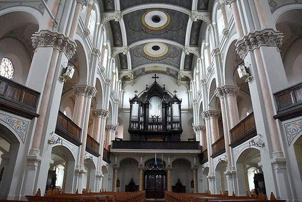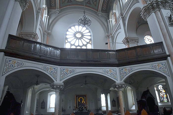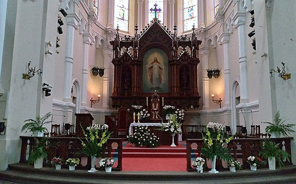 耶穌聖心教堂正殿。紅磚素樸的教堂外觀的裡是一座新羅馬式的木製中殿,巴洛克風格柱式,令人眼睛為之一亮。