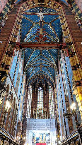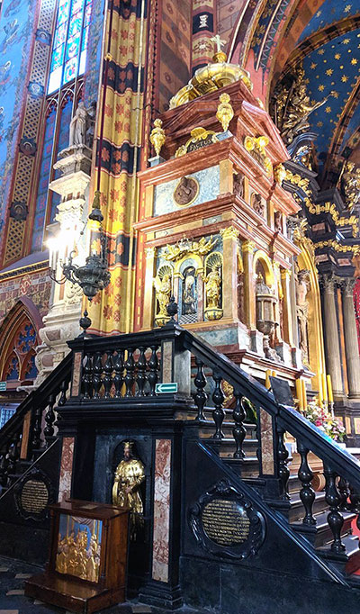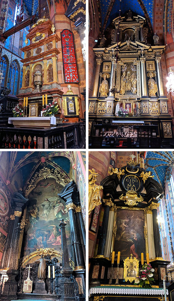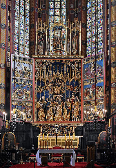 維特.斯特沃什祭壇是整個教堂最重要而又最具有特色的藝術精品,為波蘭的國寶。這座三聯畫是是世界上同類祭壇中最大、最古老的哥德式祭壇,由克拉科夫民集資興建。祭壇長11公尺,寬13公尺,由木質框架和精美的木雕組成。外部框架用橡木打造,所有的雕刻作品選用的是椴木。祭壇的台基上雕刻的是耶穌、瑪利亞和家族人物。打開祭壇,在美麗祥和的背景下,聖母在熟睡,使徒們環繞在她的身旁。在正中的上部,聖母在聖斯坦尼斯瓦夫和聖沃依切和的陪伴下加冕和升天。兩側翼門的格子架上,分別雕刻著天使報喜、耶穌降生、三國王臣服、耶穌復活、耶穌升天、聖靈離去(資料引自網路)。