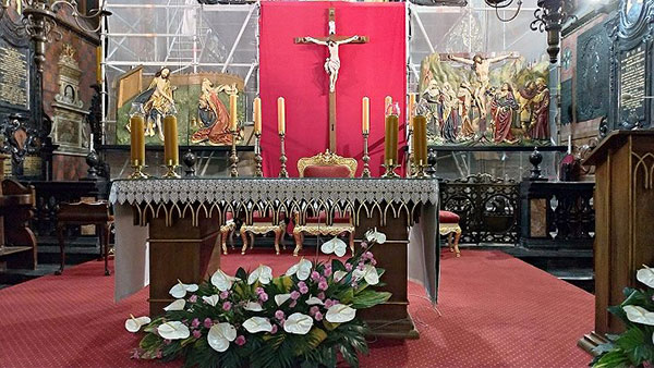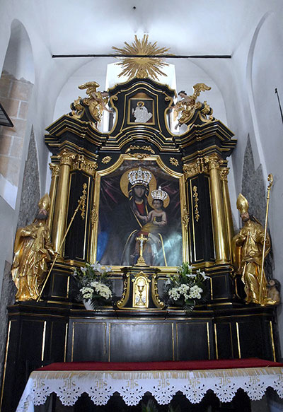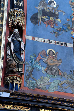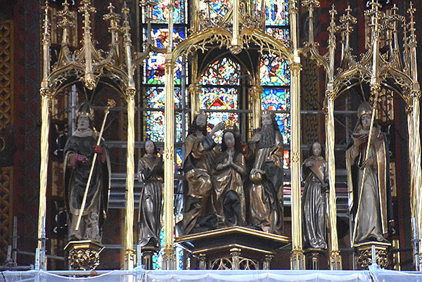 當時只能拍到祭壇的最上端:祭壇主框架外的最頂部,顯示了聖母瑪利亞的加冕禮,兩側是聖斯坦尼斯勞斯和布拉格聖阿達爾伯特的人物。