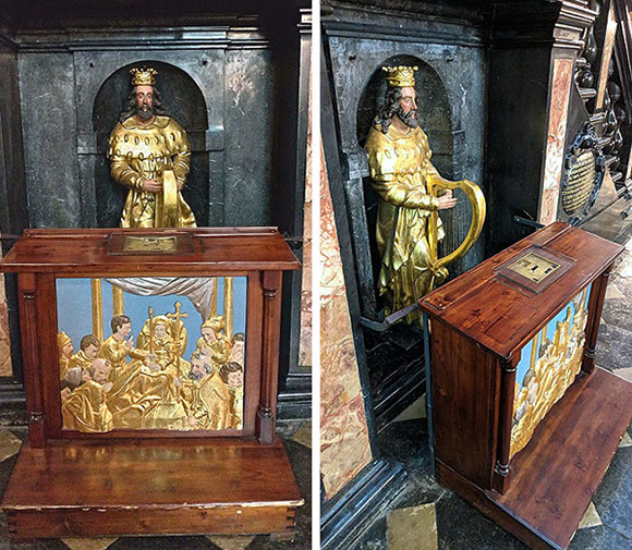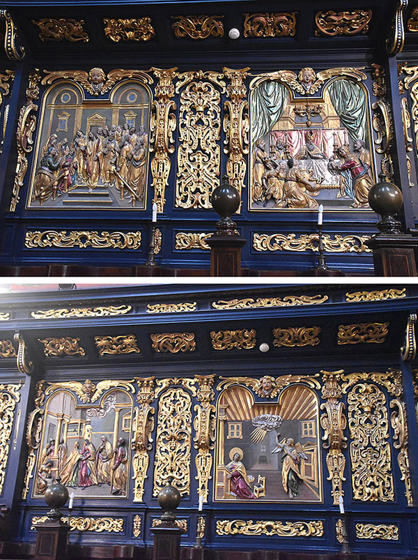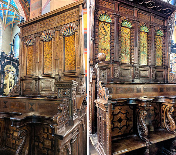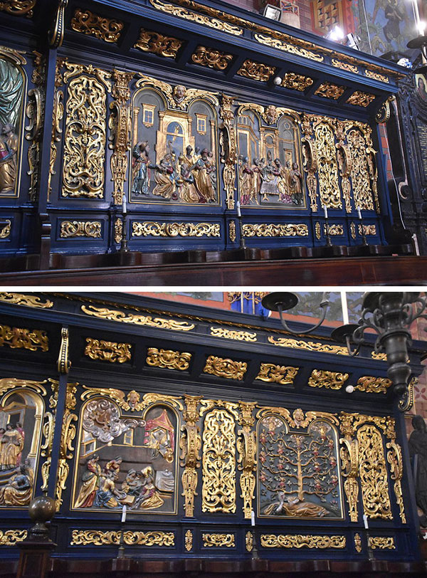 16世紀,中央通道兩側都設置了具簷篷的座位,上面裝有籃底金雕的壁板,壁板上刻有耶穌基督和聖母瑪利亞的生平。