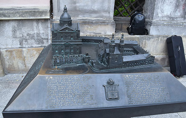給視障人士感受聖母聖殿的銅製模型。模型後教堂側邊這個門才是參觀聖母聖殿的出入口。