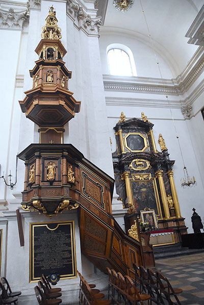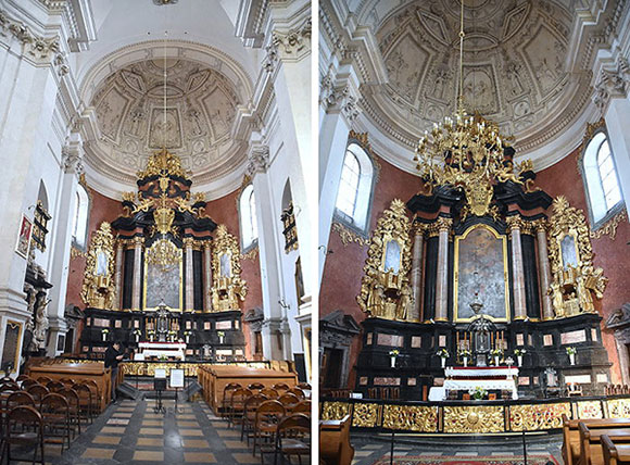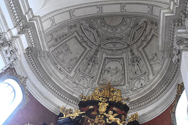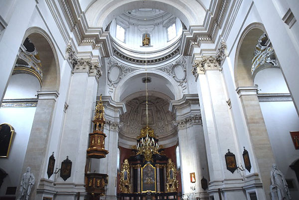 | 沒有彩繪穹頂的巴洛克風格內部,其實很樸實無華。 |