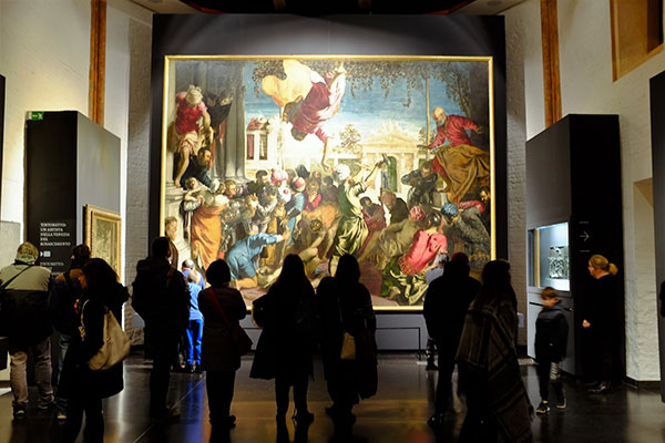 來的時候正好有「青年丁托列托」Il Giovane Tintoretto (Young Tintoretto)的特展,展出威尼斯「三傑」之一的丁托列托Tintoretto年輕時期的畫作。背景中是丁托列托在1548年畫的「奴隸的神蹟」The Miracle of the Slave (The Miracle of St. Mark) 。