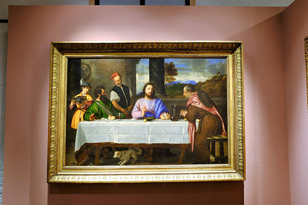 也是「三傑」之一的提香Tiziano Vecellio (Titian)在1533年-1534年間畫的「以馬忤斯的晚餐」The Supper at Emmaus。這是「學院美術館」特別從巴黎「羅浮宮」借來展出的提香畫作,畫作描述的是耶穌復活之後在名叫以馬忤斯Emmaus的小鎮向祂的門徒現身的故事。