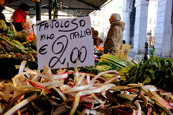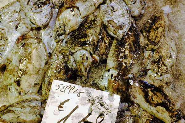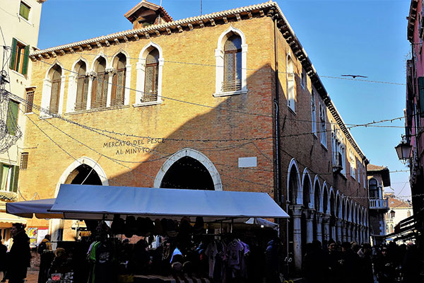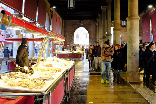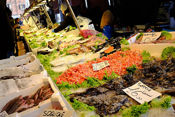 靠海吃海,威尼斯也是在義大利北部大城中吃海鮮吃得比較厲害的一座城市。威尼斯的「里阿爾托」Rialto一區自古以來就是威尼斯的心臟地區。這裡有出名的地標「里阿爾托橋」Ponte di Rialto,也是威尼斯的傳統市場「里阿爾托市場」Mercato di Rialto所在。「里阿爾托市場」不僅觀光客愛來,也是在地人的主要市場。它有露天賣新鮮蔬果和各式乾貨的市場,但是更精彩的是靠著「大運河」Canale Grande的兩幢老建築裡的魚市場Mercato del Pesce al Minuto。對於一個習於用吃食和氣味來辨認一座城市的旅人,這座魚市場是定位威尼斯的座標,每年吸引了無數的觀光客,也是屬於威尼斯的獨特氣味。
