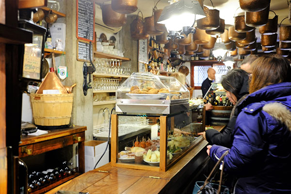 你如果想再更深一層追尋威尼斯的歷史味道的話,那這一家就在魚市場外不遠處的小酒館「兩個摩爾人」Cantina Do Mori更是不能錯過的。「兩個摩爾人」於1462年開門,至今有將近600年的歷史。它是威尼斯最老的bacaro(威尼斯的小酒館)。它們賣的是威尼斯很特殊的傳統小吃cicchetti,最適合拿它來為你在威尼斯的食飲地圖上渡河引路。威尼斯的cicchetti有點像西班牙的tapas,是各式各樣的下酒菜。它們連模樣和吃法都像:像是把各式各樣的海鮮擺在切片的麵包上,用醃鱈魚炸的丸子,切片的厚片煎蛋,或是各式各樣的起士都可以拿來當cicchetti。店家把賣的東西在櫥櫃裡排開,顧客自己指指點點來挑選。在「兩個摩爾人」裡點一杯論杯賣的酒,再選幾樣cicchetti。數百年來的威尼斯人就站在同一個位置吃同樣的味道。