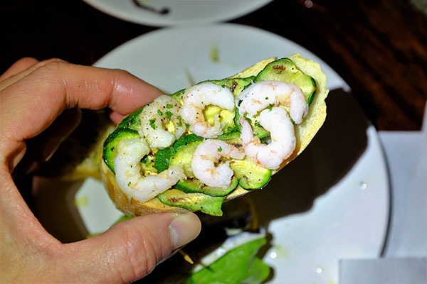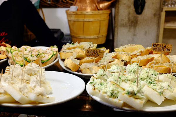 cicchetti有點像西班牙的tapas,連模樣和吃法都像:像是把各式各樣的海鮮擺在切片的麵包上,炸丸子,煎蛋,各式各樣的起士都可以拿來當cicchetti。