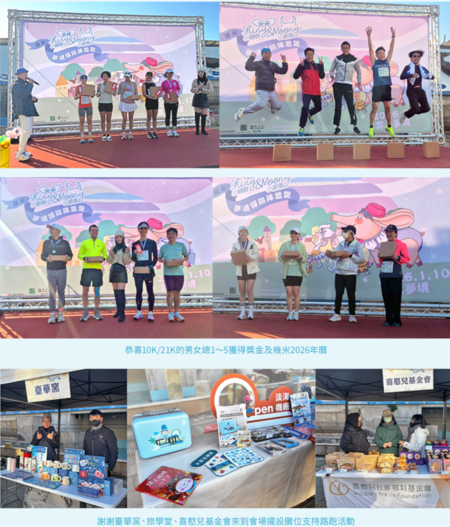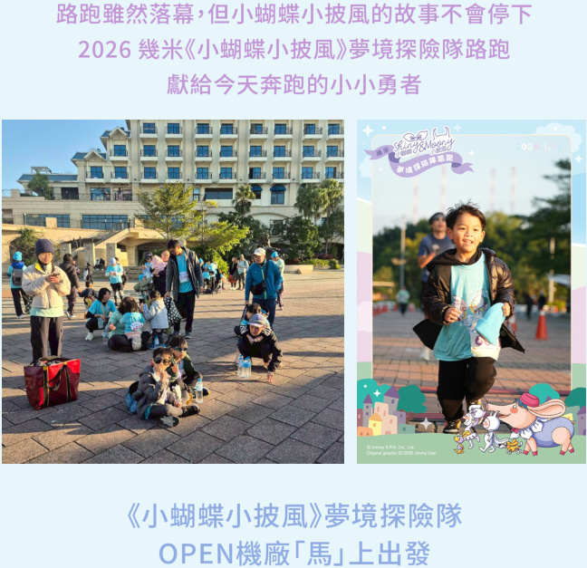 本屆幾米路跑,非常榮幸獲得「大塊文化」、「上品寢具床墊館」、「BraveLog運動趣」、「臺華窯」 及「喜憨兒基金會」的贊助與支持活動,也特別感謝主辦單位眾點資訊FocusLine 及主持人林淦鈿再次陪伴與「21K勇敢追夢、10K夢境探險、3K夢的開始與3K小蝴蝶小披風組」繼續向前;這段路程中,有奮力振翅、突破體能極限的探險家,有帶著好奇心、在夢境中悠遊的旅人,還有許多像小蝴蝶與小披風一樣,在自己的世界努力向前衝。2026.1.10,也謝謝所有的家長用汗水與步伐親自示範,當孩子回頭看,而我們一直都在,全齡路跑是一種強而有力的陪伴,當他說不行了,我們只需要陪著他往終點的方向就好了。