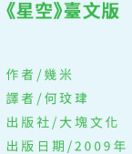 《星空》(華文版)自出版以來,深受評論界與讀者喜愛,不僅屢次再版,也陸續被翻譯成十四種語言,在世界各地榮獲多項殊榮。這個動人的故事繞行全球,用不同語言述說之後,如今終於要以臺文呈現。