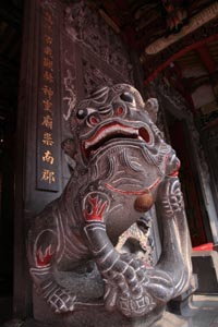前殿中門一對石獅雕刻精細,正面牆堵亦全以石材構成,左右兩邊的身堵與裙堵雕鑿手法不同,很可能是由兩班匠師分別製作。前殿側邊對看堵有一幅刻著人物持旗、球的深浮雕石刻,暗喻著「祈求」。