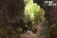 深入林蔭,巨大珊瑚礁岩壁宛如被硬生生劈開。大崗山人文協會理事長張美娟解說,這條因地層斷裂形成的天然溝谷,全長約285公尺,兩側峭壁高達20公尺。岩壁上,爬藤與盤龍木緊緊纏繞石灰岩肌理,如龍蜿蜒攀附向上之姿態,而得「盤龍」之名。