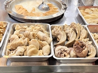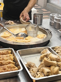 豬肉料理五花八門,我更鐘情、看到必點的是各種閩南語稱為「腹內(pak-lāi)」,也就是內臟類的總稱,還算好辨識的是腹腔的心肝胃腸腎臟等,一頭豬除了身體部位,包含頭部和四肢都被統稱為「副產品」。「副產品」通常會進到麵攤,成為麵食的配角滷味,而台北街頭的粗米粉湯和切料不太一樣的是,米粉和切料同鍋一起煮,因此切料的好壞決定的米粉的味道。如此一來,關鍵的前置處理是否有充足的去除雜質,十分重要,也是評斷一家店好壞的標準。