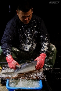 | ▲虱目魚魚鱗很硬,因此上岸後,有些會依訂購者需求立即以電動機器去鱗,去鱗畫面很療癒,而去鱗工人也很快全身沾滿魚鱗。