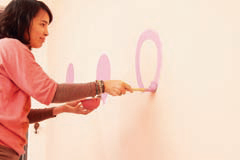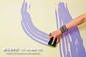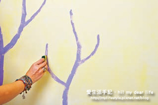 2. 將紫色底漆倒入漆盤中。倒入水(漆料和水的比例為5比1)後,以竹筷將水和底漆攪拌均勻。將完成的樹枝狀菜瓜布,沾上調好的漆料後,在牆面上畫出樹幹的圖案。 【point 可先在報紙上測試菜瓜布所含漆料是否過多或過少】