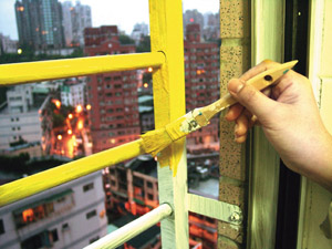 1. 刷上色彩鮮豔的黃色,把外面的鐵窗納進窗戶的一部份。