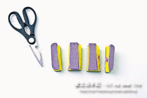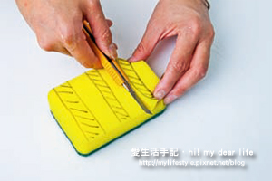 1. 先以奇異筆在菜瓜布上畫出樹枝狀的線條,以美工刀裁切掉不要的部分。