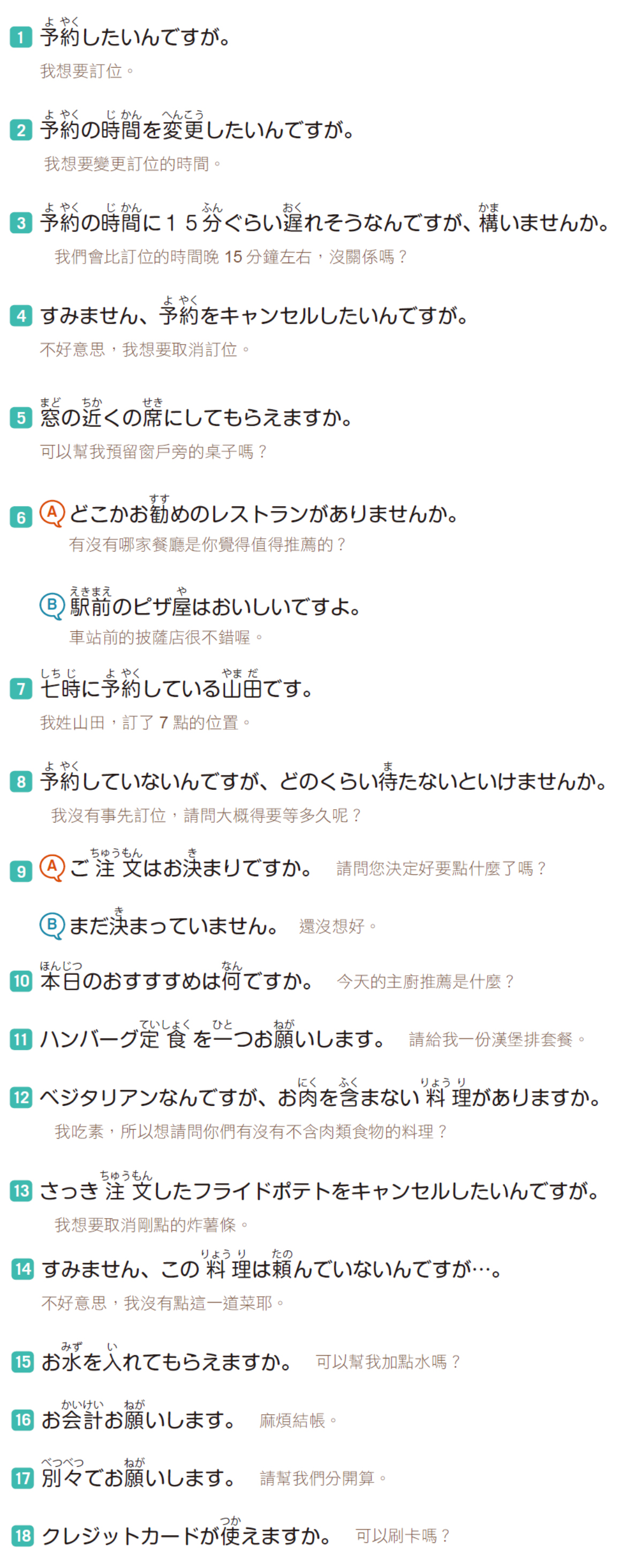 以餐廳接待客人的服務流程為主軸,從迎賓、點餐、上菜、結帳、客訴處理、電話應對等,全面涵蓋8大主題、20個單元,提供餐飲從業人員學習正式而簡潔的商務日語情境會話,並包含服務顧客的小知識,內容完備,幫助你快速掌握專業餐飲日語。 ....詳全文 |